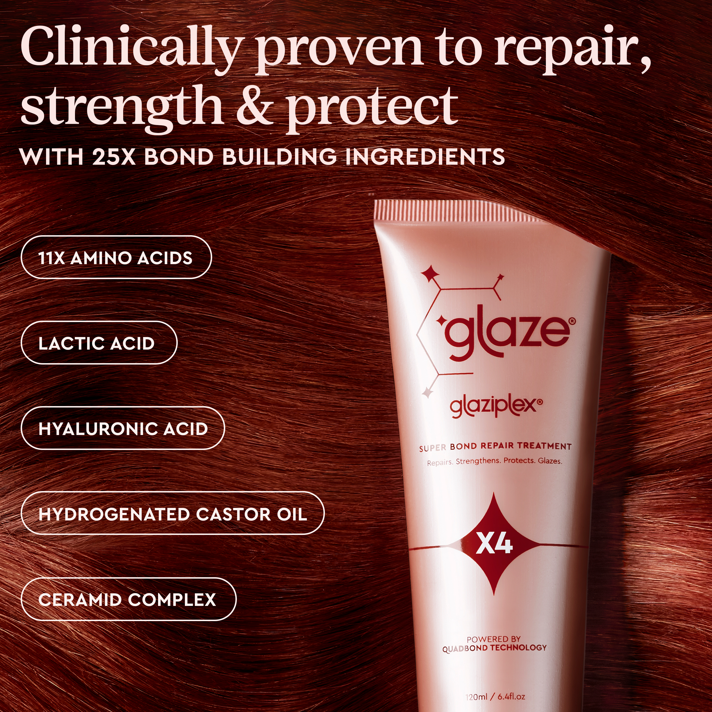 Damage undone, glaze on top. GlaziPlex Super Bond Repair Treatment works on the hair’s inner structure, whilst also adding show-stopping, look-at-me levels of glossy shine.