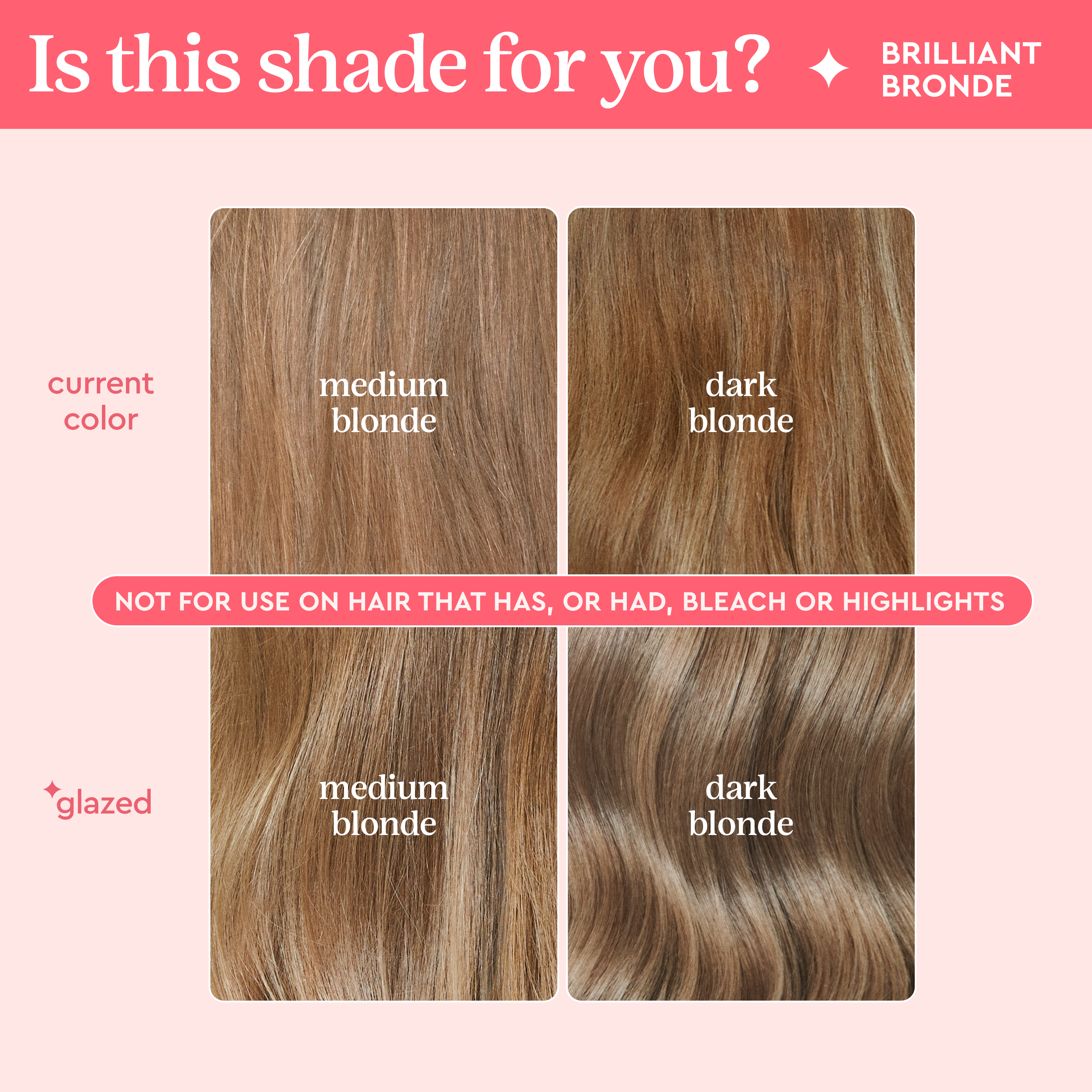 For dark brown to light brown virgin or color-treated hair to deepens blonde tones for a natural bronde finish. Not suitable for bleached or highlighted hair.