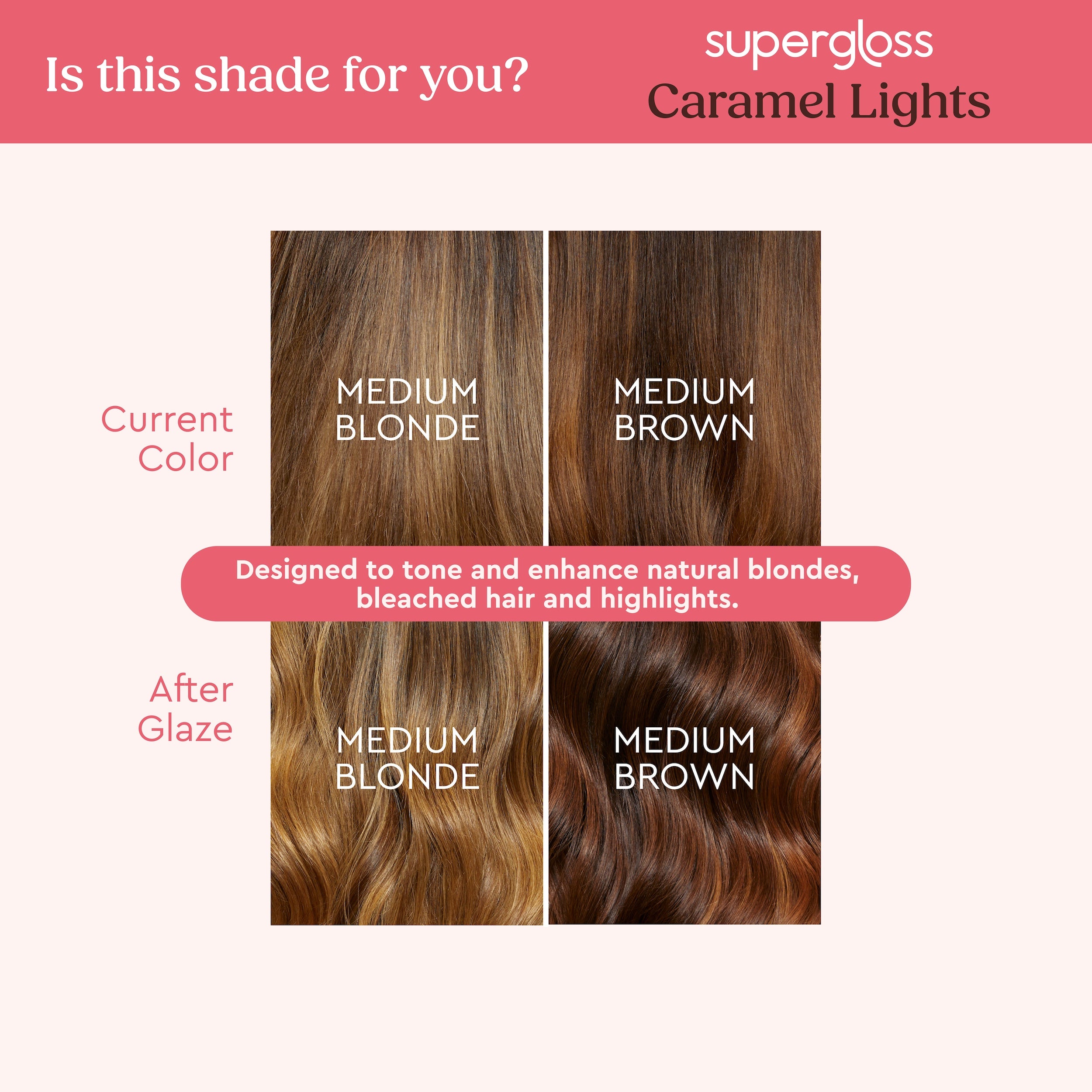 Our Supergloss shades for blondes and highlights neutralize unwanted tones to refresh your color in 10 minutes. Warning: Supergloss is designed to enhance your current shade, not to change your hair color or cover grays. Darker shades are not suitable for use on pre-lightened, blonde or highlighted hair as this risks staining, even if you have subsequently dyed over the lightened sections.